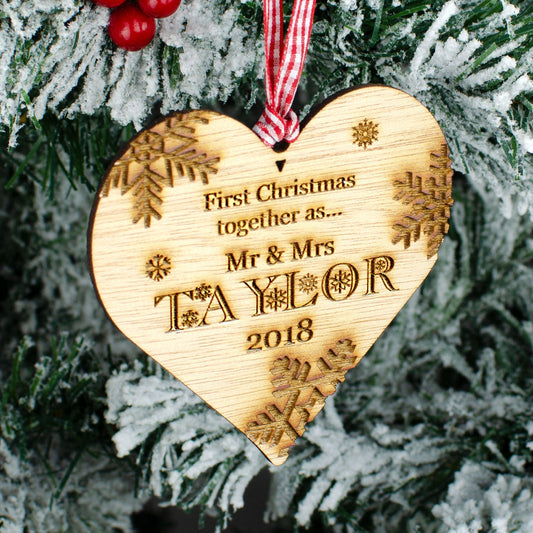 First Christmas Together, Personalised Heart Christmas Decoration, Wood.